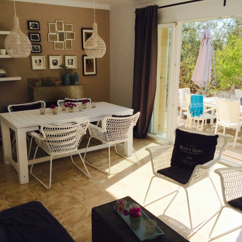 Die Küche ist voll ausgestattet und hat einen eigenen Zugang zum Garten. Davor befindet sich im Schatten der Olivenbäume eine Chillecke mit Outdoor-Sesseln. Hier gibt es ausreichend Liegen und Sessel zum Sonnen oder Lesen.